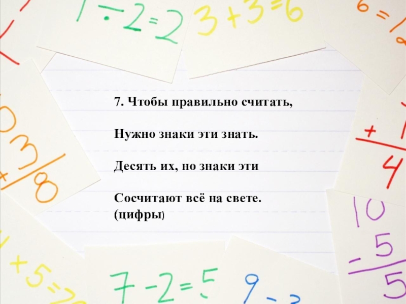 7. Чтобы правильно считать,Нужно знаки эти знать.Десять их, но знаки этиСосчитают всё на свете. (цифры)