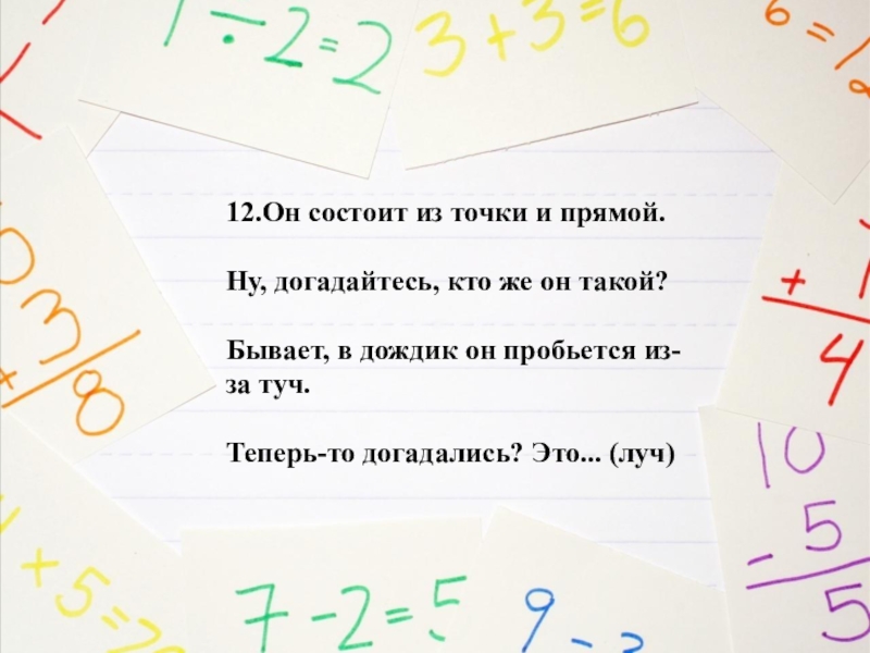 12.Он состоит из точки и прямой.Ну, догадайтесь, кто же он такой?Бывает, в дождик он пробьется из-за туч.Теперь-то