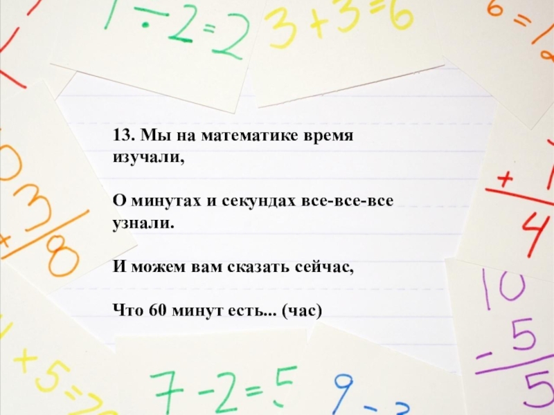 13. Мы на математике время изучали,О минутах и секундах все-все-все узнали.И можем вам сказать сейчас,Что 60 минут