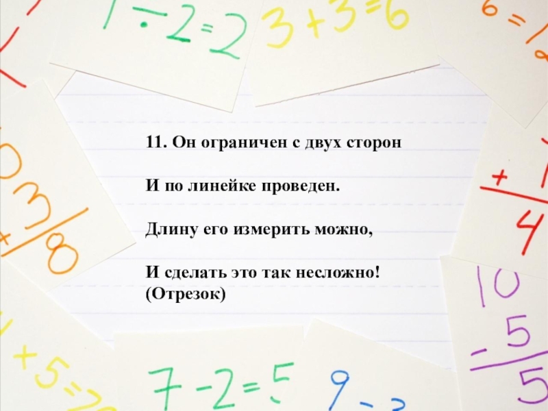 11. Он ограничен с двух сторонИ по линейке проведен.Длину его измерить можно,И сделать это так несложно! (Отрезок)
