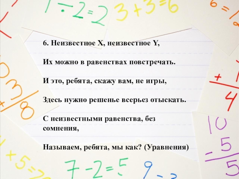 6. Неизвестное X, неизвестное Y,Их можно в равенствах повстречать.И это, ребята, скажу вам, не игры,Здесь нужно решенье