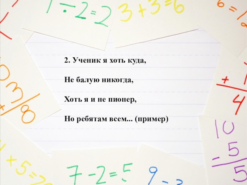2. Ученик я хоть куда,Не балую никогда,Хоть я и не пионер,Но ребятам всем... (пример)