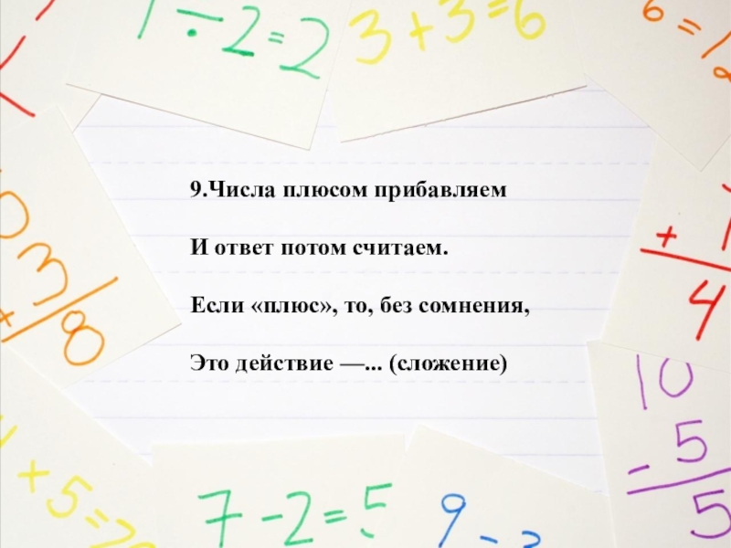 9.Числа плюсом прибавляемИ ответ потом считаем.Если «плюс», то, без сомнения,Это действие —... (сложение)