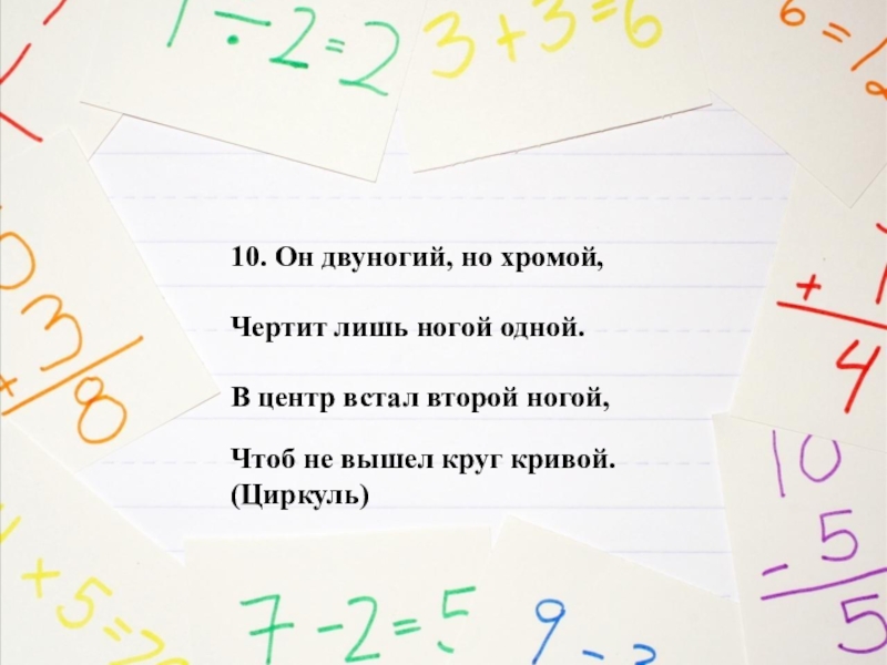 10. Он двуногий, но хромой,Чертит лишь ногой одной.В центр встал второй ногой,Чтоб не вышел круг кривой. (Циркуль)