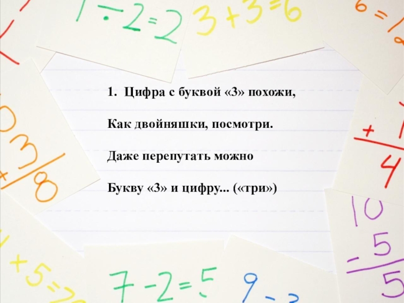 1. Цифра с буквой «3» похожи,Как двойняшки, посмотри.Даже перепутать можноБукву «3» и цифру... («три»)