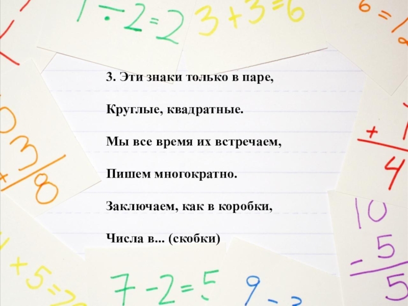 3. Эти знаки только в паре,Круглые, квадратные.Мы все время их встречаем,Пишем многократно.Заключаем, как в коробки,Числа в... (скобки)