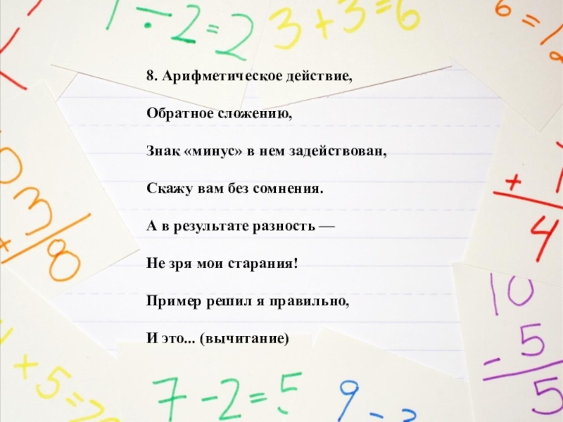 8. Арифметическое действие,Обратное сложению,Знак «минус» в нем задействован,Скажу вам без сомнения.А в результате разность —Не зря мои