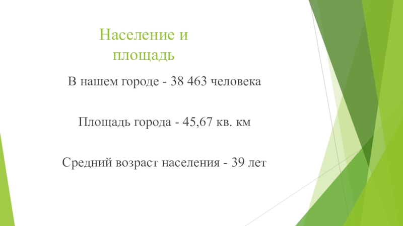 Население и  площадьВ нашем городе - 38 463 человекаПлощадь города - 45,67 кв. кмСредний возраст населения