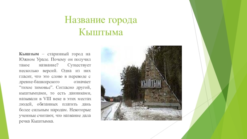 такое название? Существует несколько версий. Одна из них гласит, что это слово в переводе с древне-башкирского означает “тихое зимовье”. Согласно другой, кыштымцами, то есть данниками, называли в VIII веке в этих местах людей, обязанных платить дань более сильным народам. Некоторые ученные считают, что название дала речка Кыштымка.