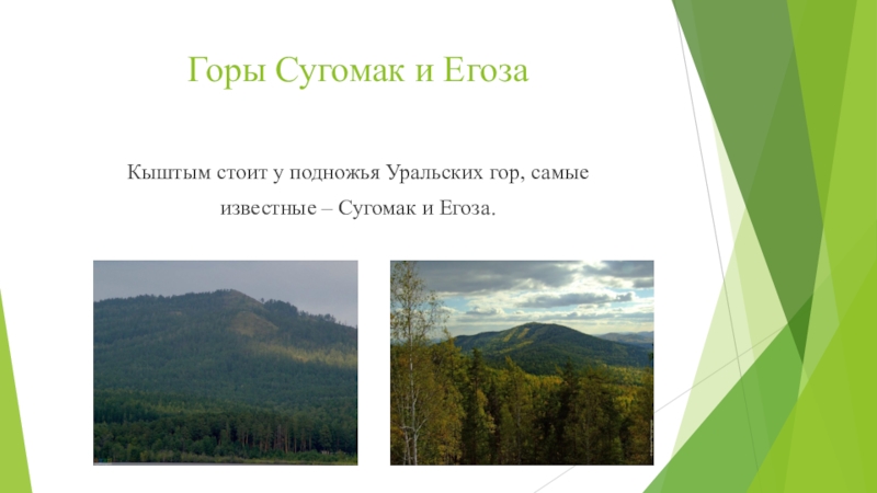 Горы Сугомак и ЕгозаКыштым стоит у подножья Уральских гор, самыеизвестные – Сугомак и Егоза.