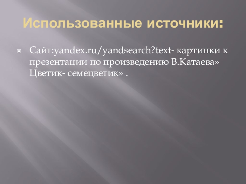 Использованные источники:Сайт:yandex.ru/yandsearch?text- картинки к презентации по произведению В.Катаева»Цветик- семецветик» .