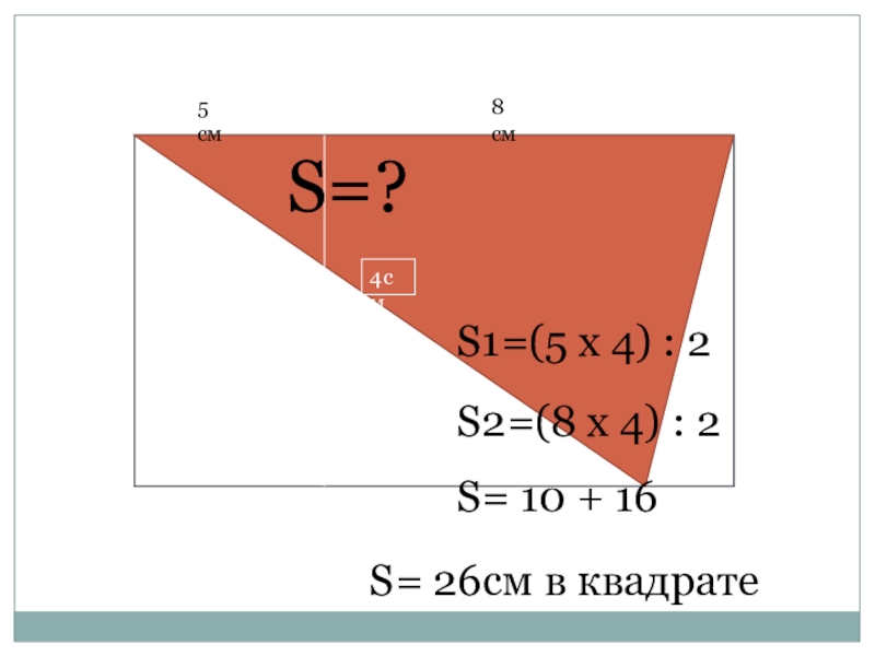 5 cм8 см4смS=?S1=(5 х 4) : 2S2=(8 х 4) : 2S= 10 + 16S= 26см в квадрате