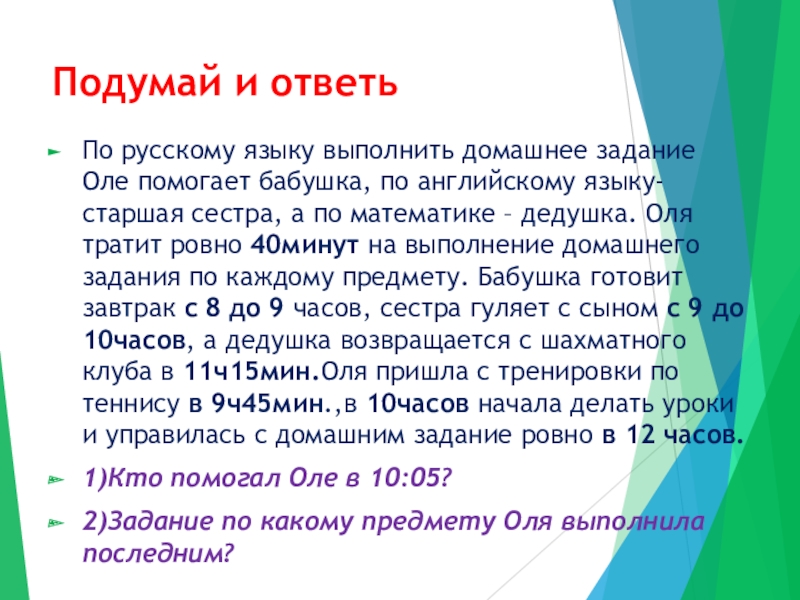 по английскому языку- старшая сестра, а по математике – дедушка. Оля тратит ровно 40минут на выполнение домашнего задания по каждому предмету. Бабушка готовит завтрак с 8 до 9 часов, сестра гуляет с сыном с 9 до 10часов, а дедушка возвращается с шахматного клуба в 11ч15мин.Оля пришла с тренировки по теннису в 9ч45мин.,в 10часов начала делать уроки и управилась с домашним задание ровно в 12 часов.