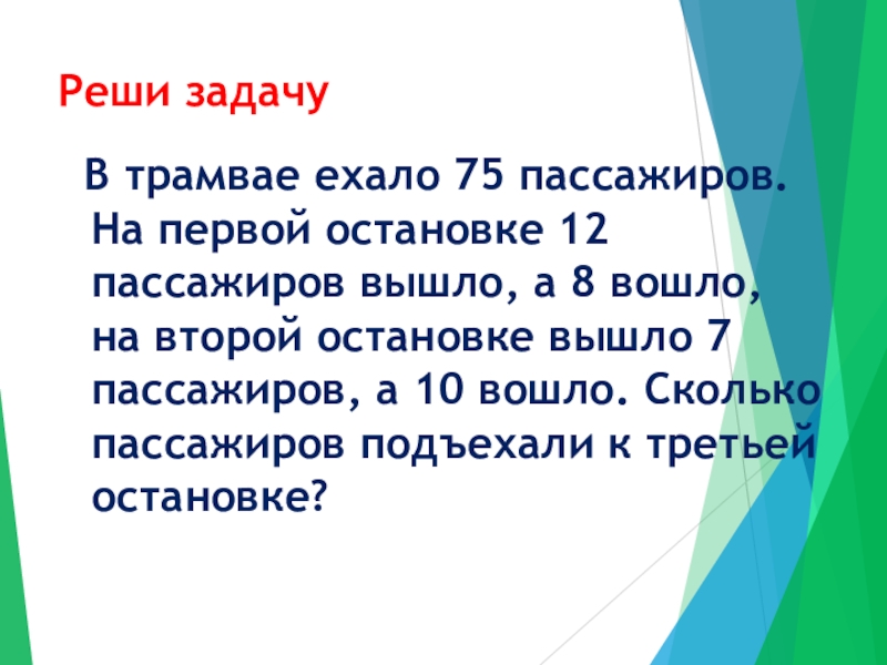 Реши задачу В трамвае ехало 75 пассажиров. На первой остановке 12 пассажиров вышло, а 8 вошло, на