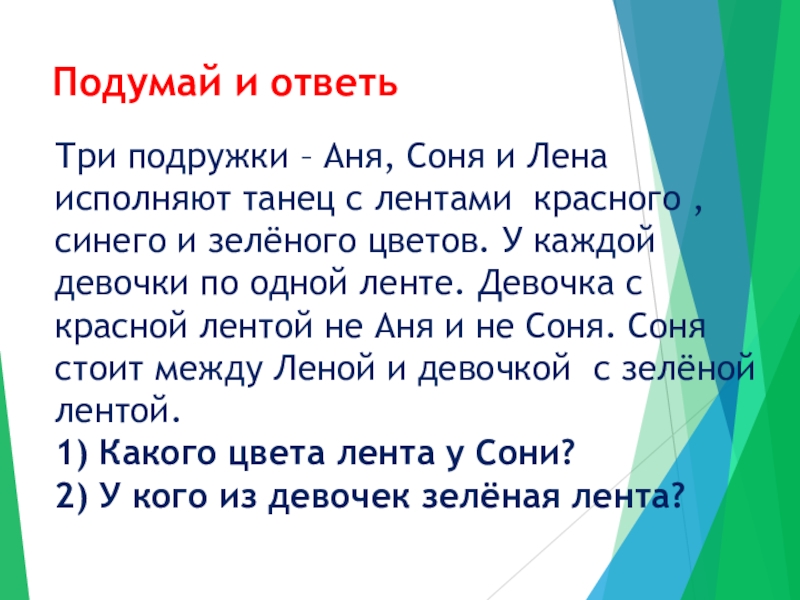 Подумай и ответьТри подружки – Аня, Соня и Лена исполняют танец с лентами красного , синего и зелёного цветов. У каждой девочки по одной ленте. Девочка с красной лентой не Аня и не Соня. Соня стоит