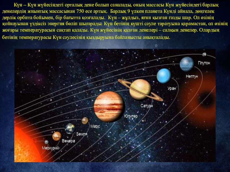 саналады, оның массасы Күн жүйесіндегі барлық денелердің жиынтық массасынан 750 есе артық. Барлық 9 үлкен планета Күнді айнала, дөңгелек дерлік орбита бойымен, бір бағытта қозғалады. Күн – жұлдыз, яғни қызған газды шар. Ол өзінің қойнауынан үздіксіз энергия бөліп шығарады. Күн бетінің күшті сәуле таратуына қарамастан, ол өзінің жоғары температурасын сақтап қалады. Күн жүйесінің қалған денелері – салқын денелер. Олардың бетінің температурасы Күн сәулесінің қыздыруына байланысты анықталады.