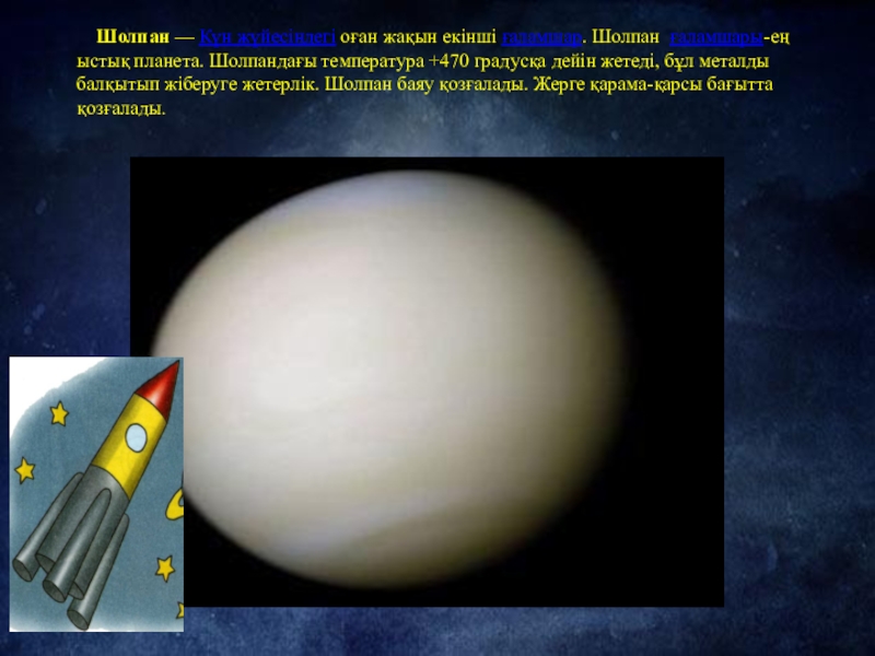 Шолпан — Күн жүйесіндегі оған жақын екінші ғаламшар. Шолпан ғаламшары-ең ыстық планета. Шолпандағы