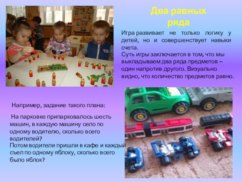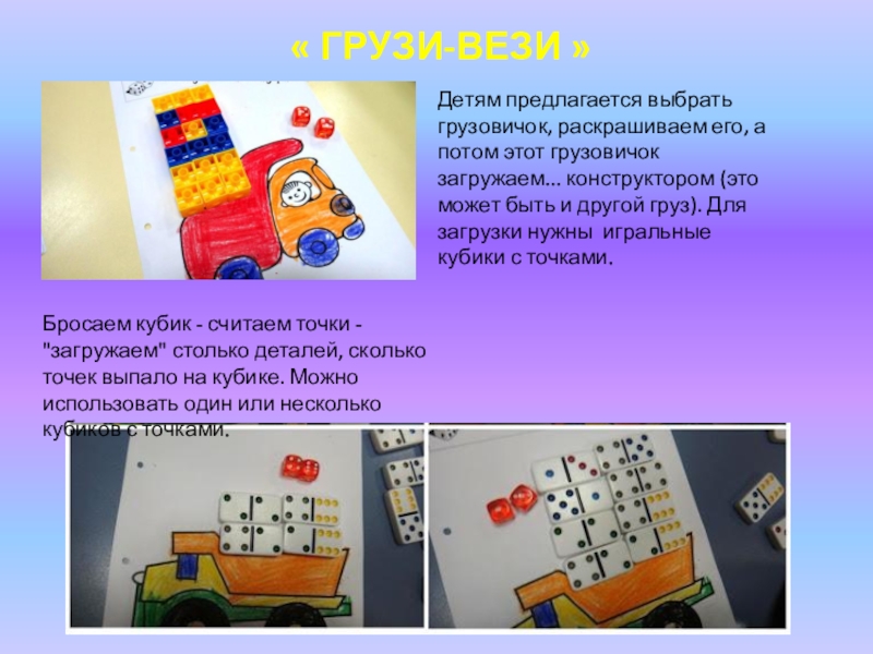 Бросаем кубик - считаем точки - "загружаем" столько деталей, сколько точек выпало на кубике. Можно использовать один или несколько кубиков с точками.