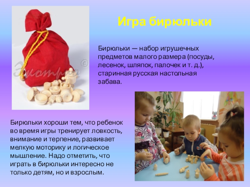 Бирюльки хороши тем, что ребенок во время игры тренирует ловкость, внимание и терпение, развивает мелкую моторику и логическое мышление. Надо отметить, что играть в бирюльки интересно не только детям, но и взрослым.