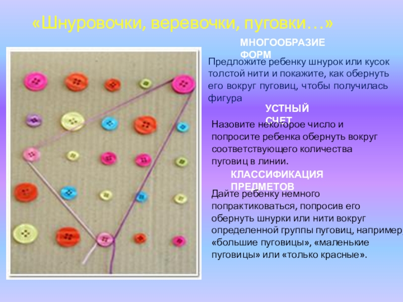 Дайте ребенку немного попрактиковаться, попросив его обернуть шнурки или нити вокруг определенной группы пуговиц, например, «большие пуговицы», «маленькие пуговицы» или «только красные».