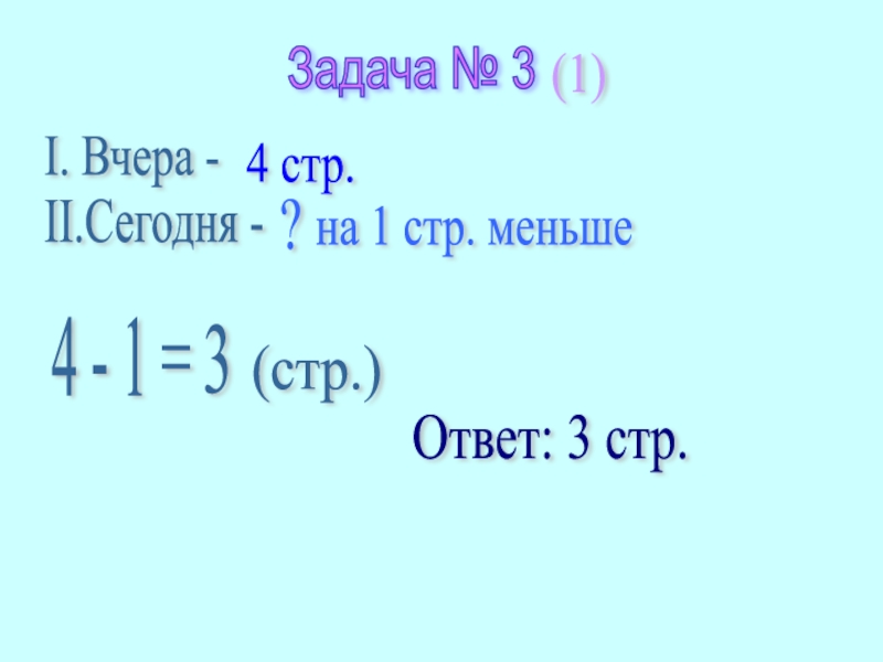Задача № 3I. Вчера -II.Сегодня -4 стр.  на 1 стр. меньше?4 - 1 =(стр.)Ответ: 3 стр.(1)3