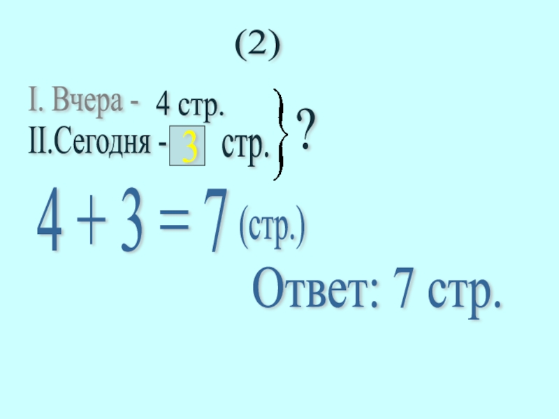 I. Вчера -II.Сегодня -4 стр.3стр.4 + 3 = 7(стр.)Ответ: 7 стр.(2)?