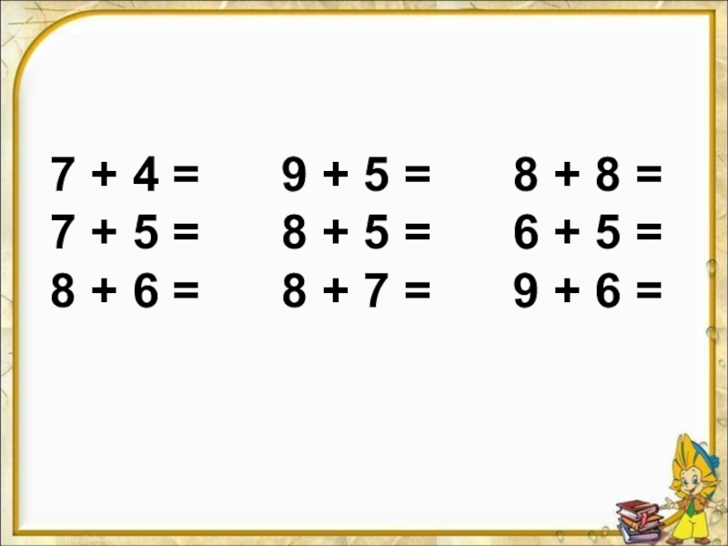 Слайд 147 + 4 = 9 + 5 =