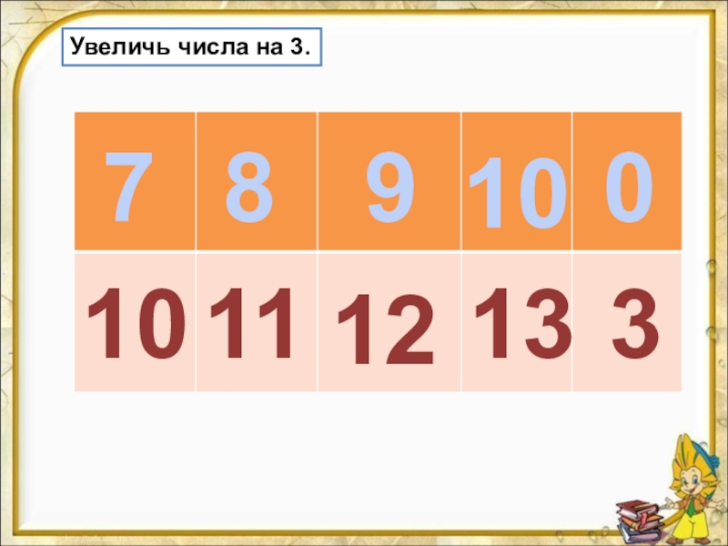 Слайд 6Увеличь числа на 3.