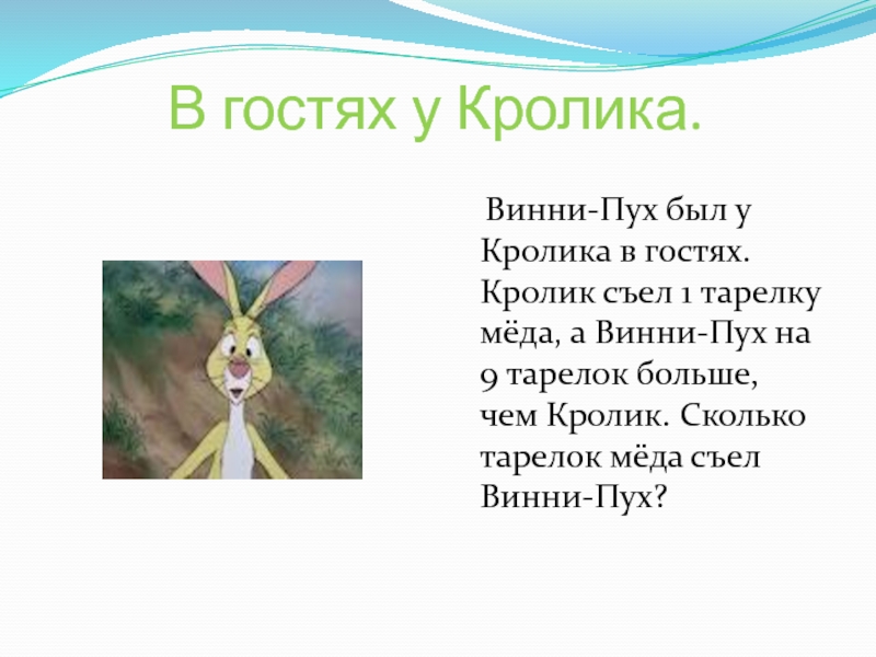 В гостях у Кролика.  Винни-Пух был у Кролика в гостях. Кролик съел 1 тарелку мёда, а