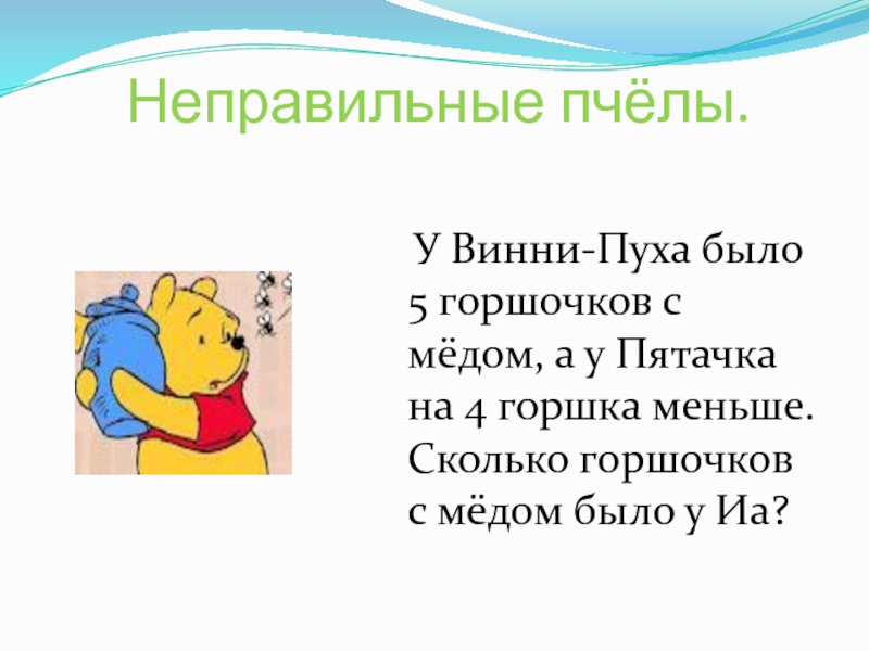Неправильные пчёлы.  У Винни-Пуха было 5 горшочков с мёдом, а у Пятачка на 4 горшка меньше.