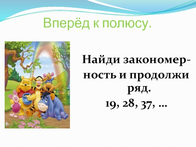 Вперёд к полюсу.Найди закономер-ность и продолжи ряд.19, 28, 37, …