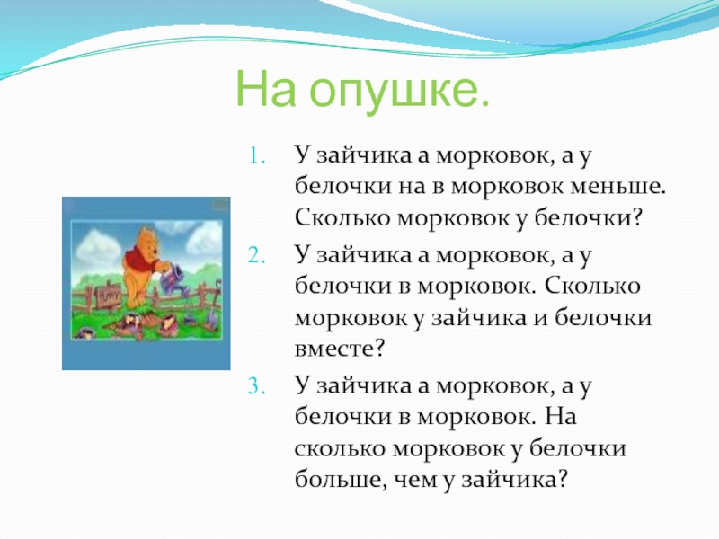 На опушке.У зайчика а морковок, а у белочки на в морковок меньше. Сколько морковок у белочки?У зайчика