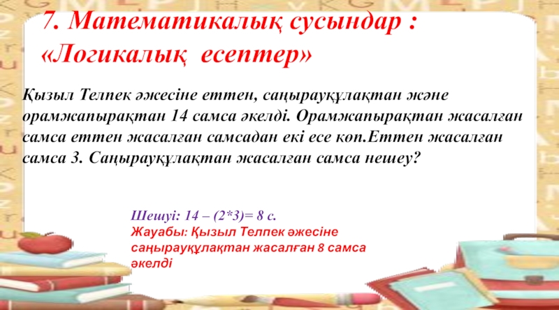 Жауабы: Қызыл Телпек әжесіне саңырауқұлақтан жасалған 8 самса әкелді