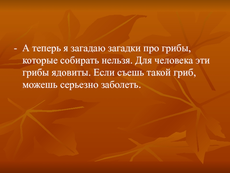 - А теперь я загадаю загадки про грибы, которые собирать нельзя. Для человека эти грибы ядовиты. Если
