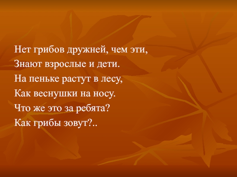 Нет грибов дружней, чем эти,Знают взрослые и дети.На пеньке растут в лесу,Как веснушки на носу.Что же это