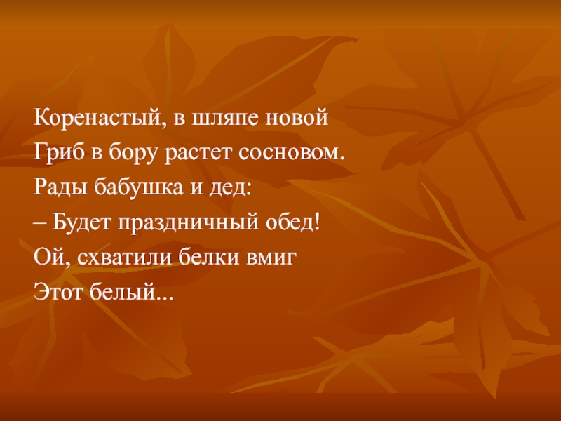 Коренастый, в шляпе новойГриб в бору растет сосновом.Рады бабушка и дед:– Будет праздничный обед!Ой, схватили белки вмигЭтот