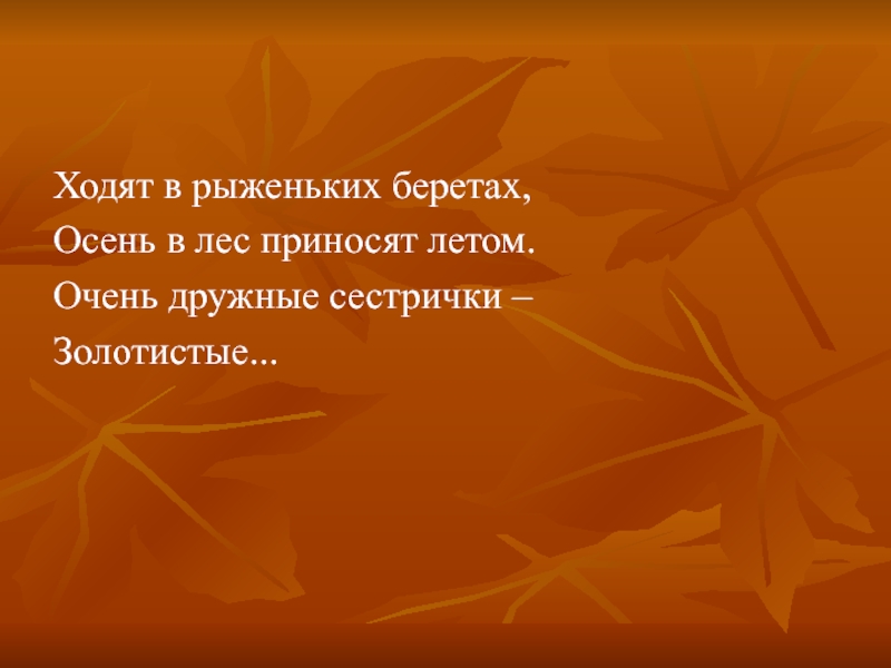 Ходят в рыженьких беретах,Осень в лес приносят летом.Очень дружные сестрички –Золотистые...