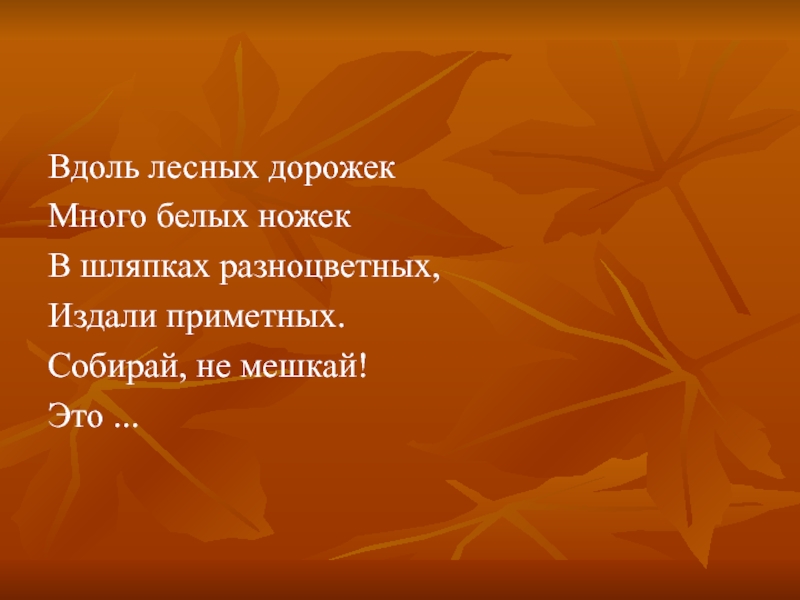 Вдоль лесных дорожекМного белых ножекВ шляпках разноцветных,Издали приметных.Собирай, не мешкай!Это ...