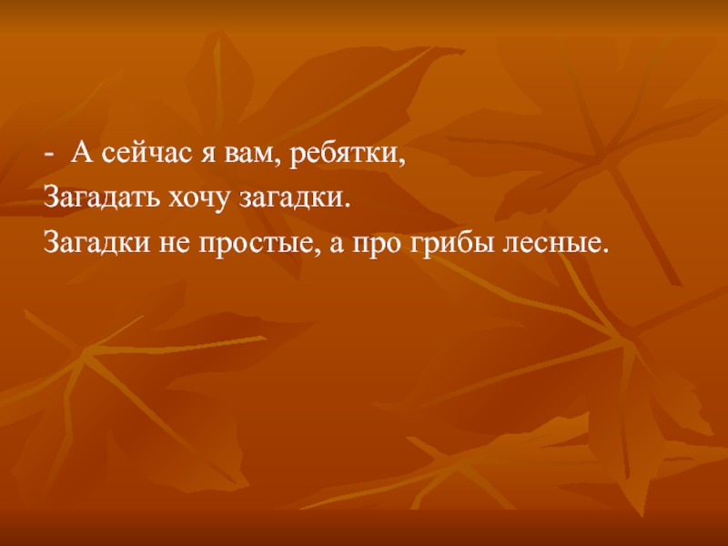 - А сейчас я вам, ребятки,Загадать хочу загадки.Загадки не простые, а про грибы лесные.