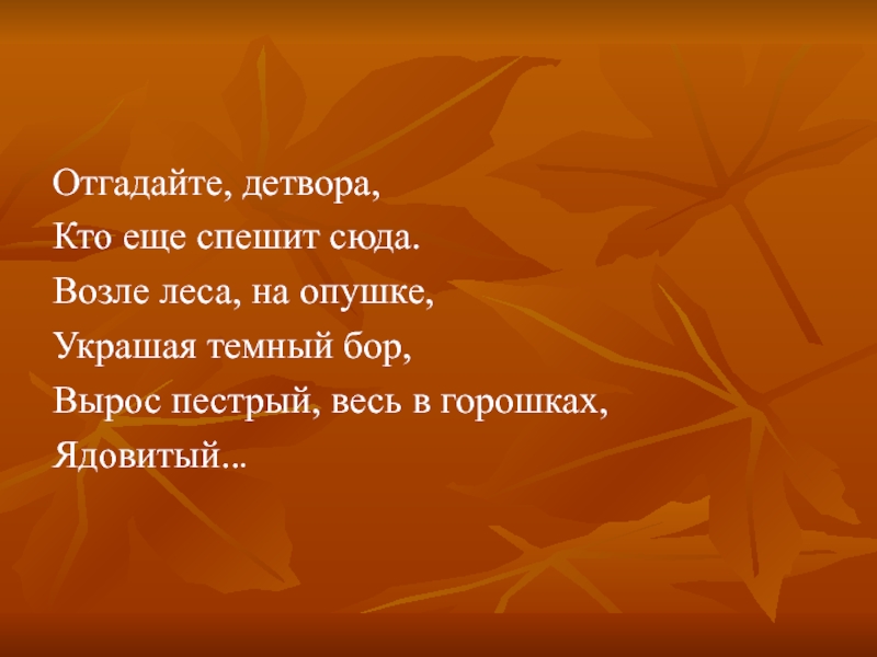Отгадайте, детвора,Кто еще спешит сюда.Возле леса, на опушке,Украшая темный бор,Вырос пестрый, весь в горошках,Ядовитый...