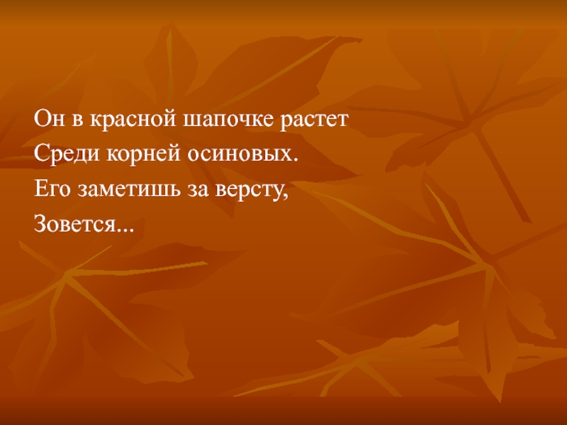 Он в красной шапочке растетСреди корней осиновых.Его заметишь за версту,Зовется...