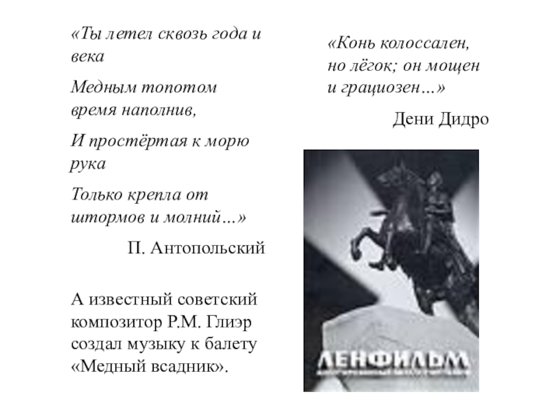 А известный советский композитор Р.М. Глиэр создал музыку к балету «Медный всадник».