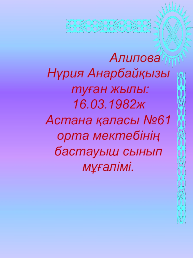 Астана қаласы №61 орта мектебінің бастауыш сынып мұғалімі.