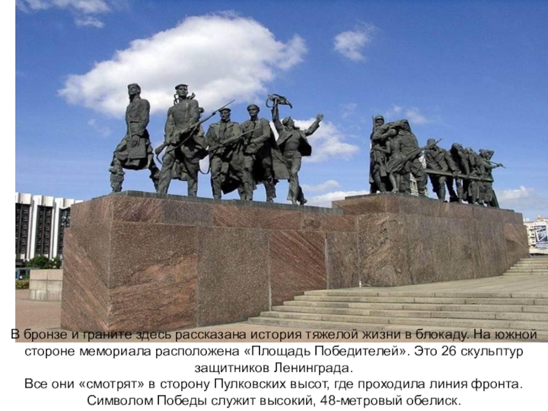Слайд 5В бронзе и граните здесь рассказана история тяжелой жизни в блокаду.