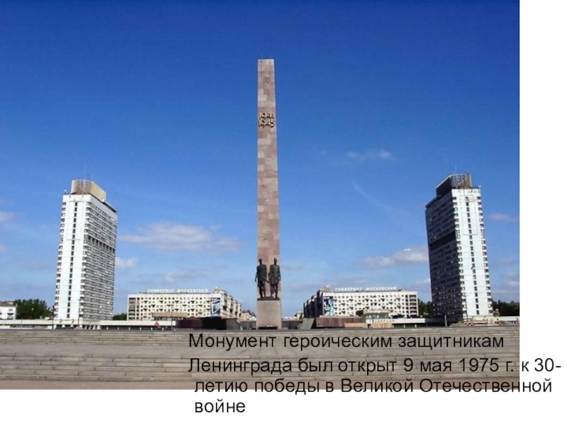Монумент героическим защитникам   Ленинграда был открыт 9 мая 1975 г. к 30-летию победы в Великой Отечественной войне