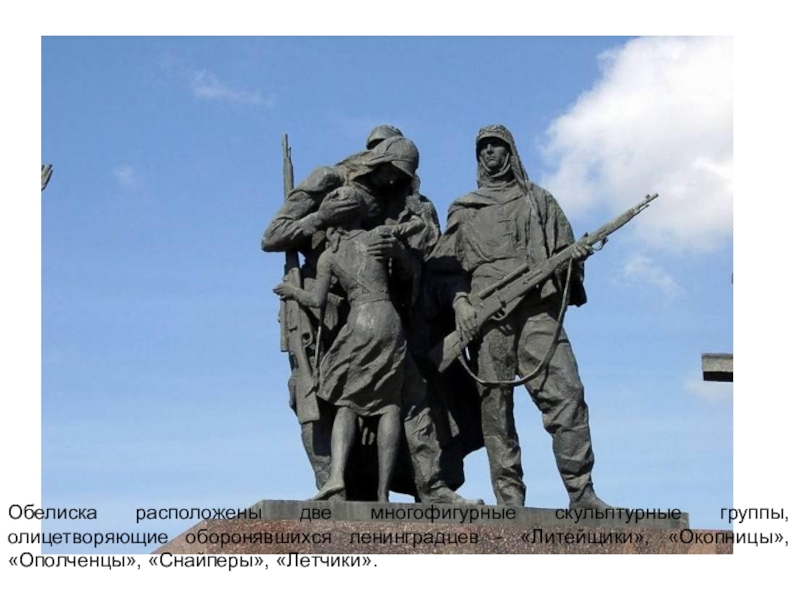 Слайд 10Обелиска расположены две многофигурные скульптурные группы, олицетворяющие оборонявшихся ленинградцев - «Литейщики»,