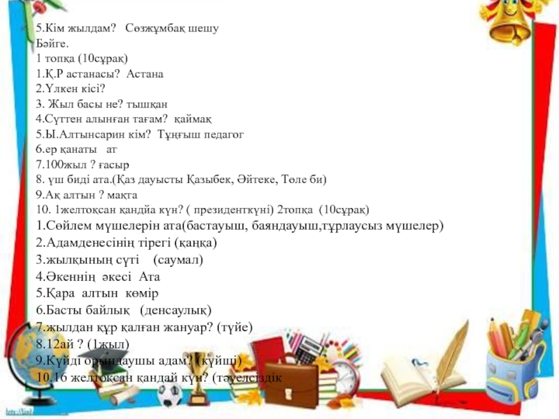 10. 1желтоқсан қандйа күн? ( президенткүні) 2топқа (10сұрақ)