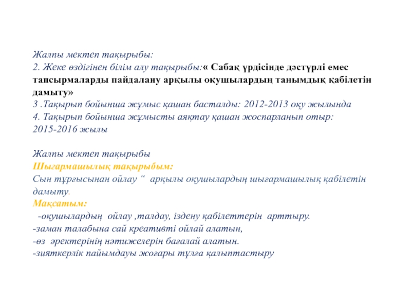 Сын тұрғысынан ойлау арқылы оқушылардың шығармашылық қабілетін дамыту Заман талабына сай оқыту үрдісінің жаңа әдіс-тәсілдерін әр мұғалім сабақ барысында қолдануы қажет. Күнделікті сабаққа дайындалу барысында мұғалімнің өз білімін жетілдіріп отыру өте маңызды үдеріс . «Назарбаев Зияткерлік мектептер» дербес білім беру ұйымы мен Кембридж университетінің білім беру факультетімен бірлесіп әзірлеген деңгейлік бағдарлама бойынша педогог кадрлардың біліктілігін арттыру курсының ұсынған модульдерінің ішіндегі мен үшін ең маңызды модулі сын тұрғысынан ойлауға үйрету. «Сын тұрғысынан ойлау бақылау, тәжірибе, толғану және синтездеуде қолданылатын әдіс болып табылады, сонымен қатар ол әрекет жасауға негіз, түрткі болуы да мүмкін» (мұғалімге арналған нұсқаулық 42-бет) Іс-әрекетті зерттеу жүргізу барысында мектептегі зерттеуге алған нысаным - 5 - сынып оқушылары. Сыныптағы оқушыларды зерттеудегі басты мақсатым - белсенділіктері төмен оқушылардың ойлау, талдау, іздену қабілеттерін арттыру. Сыныптың жалпы үлгерімі жаман емес. Бірақ берілген тапсырмалар мен сұрақтарға жалаң жауап береді, шығармашылық тұрғыдан ойлау деңгейі төмен. Сондықтан заман талабына сай креативті ойлай алатын. Зияткерлік пайымдауы жоғары тұлға қалыптастыруды алдыма қойған басты мақсат . Сыныпты зерттеу барыс