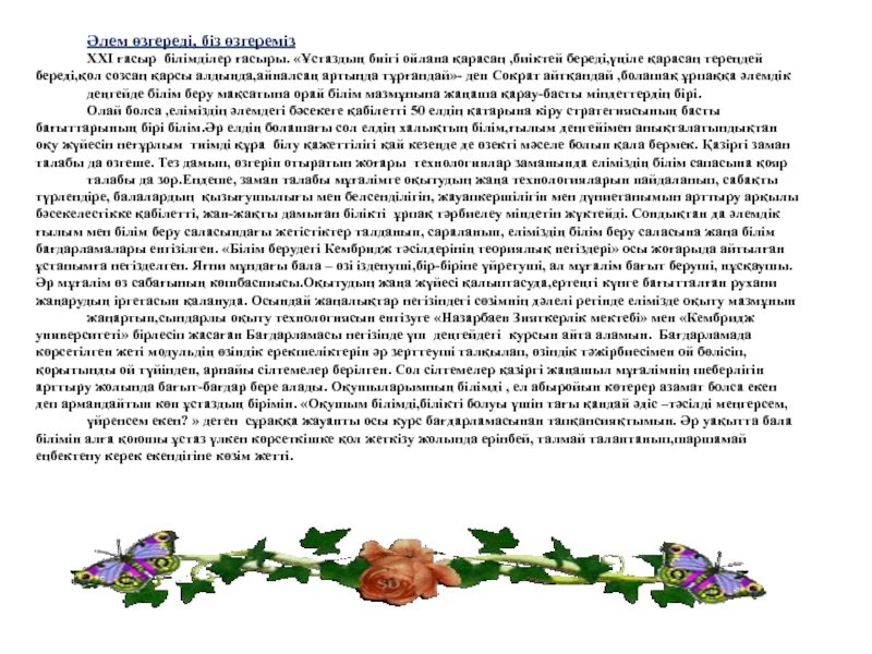 талабы да зор.Ендеше, заман талабы мұғалімге оқытудың жаңа технологияларын пайдаланып, сабақты түрлендіре, балалардың қызығушылығы мен белсенділігін, жауапкершілігін мен дүниетанымын арттыру арқылы бәсекелестікке қабілетті, жан-жақты дамыған білікті ұрпақ тәрбиелеу міндетін жүктейді. Сондықтан да әлемдік ғылым мен білім беру саласындағы жетістіктер талданып, сараланып, еліміздің білім беру саласына жаңа білім бағдарламалары енгізілген. «Білім берудегі Кембридж тәсілдерінің теориялық негіздері» осы жоғарыда айтылған ұстанымға негізделген. Яғни мұндағы бала – өзі ізденуші,бір-біріне үйретуші, ал мұғалім бағыт беруші, нұсқаушы. Әр мұғалім өз сабағының көшбасшысы.Оқытудың жаңа жүйесі қалыптасуда,ертеңгі күнге бағытталған рухани жаңарудың іргетасын қалануда. Осындай жаңалықтар негізіндегі сөзімнің дәлелі ретінде елімізде оқыту мазмұнын