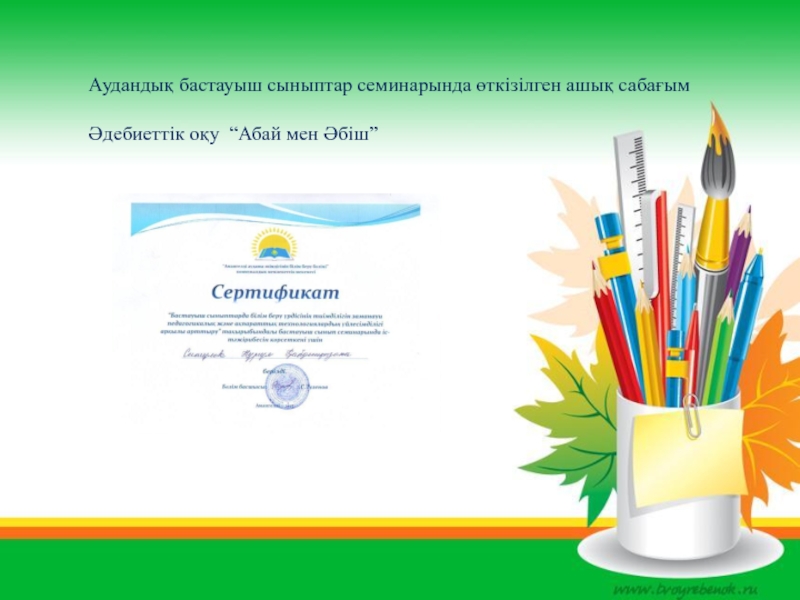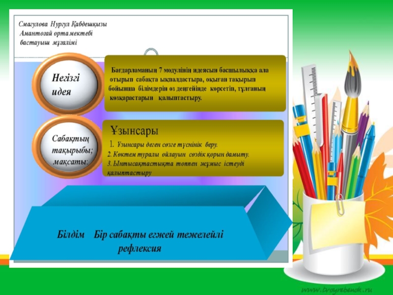 үйренсем екен? » деген сұраққа жауапты осы курс бағдарламасынан тапқансияқтымын. Әр уақытта бала білімін алға қоюшы ұстаз үлкен көрсеткішке қол жеткізу жолында ерінбей, талмай талаптанып,шаршамай еңбектену керек екендігіне көзім жетті.